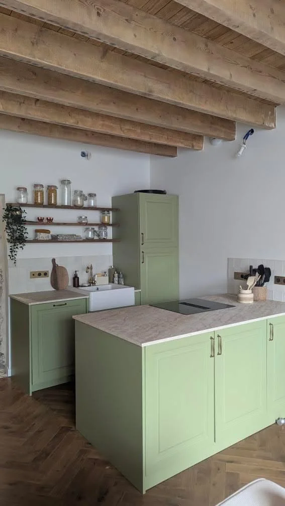 Inspirée par des matériaux bruts et nobles, la cuisine marie des zelliges, des touches de vert apaisant et du bois massif pour créer une ambiance à la fois authentique et moderne. Le reste de la pièce intègre une alcôve, des murs en chaux, et un parquet clair pour un intérieur lumineux et accueillant (voir les détails dans le dossier).